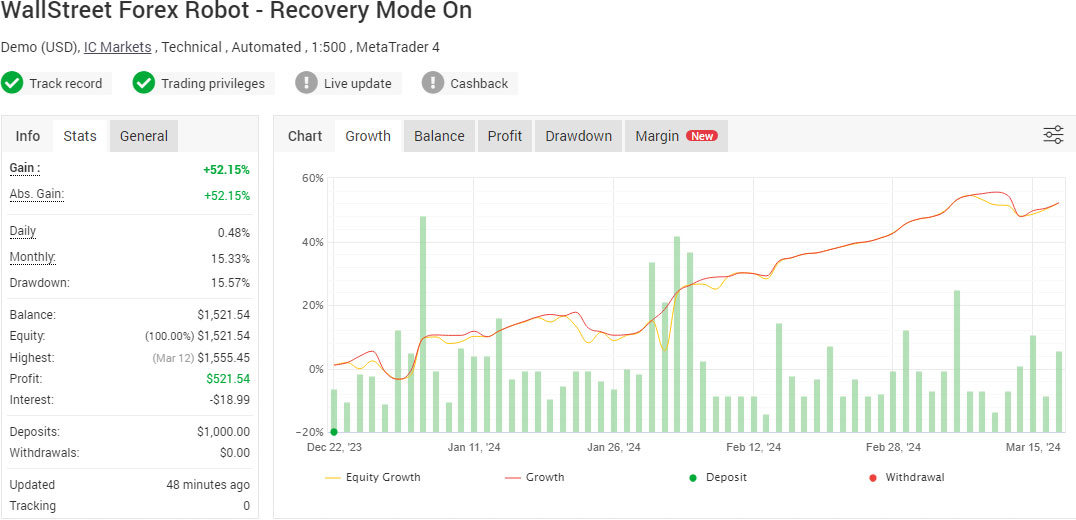 INFO: RecoveryMode is an advanced loss recovery system. When enabled the robot quickly recover all the previous losses as shown on the chart above. This improves the robot performance.