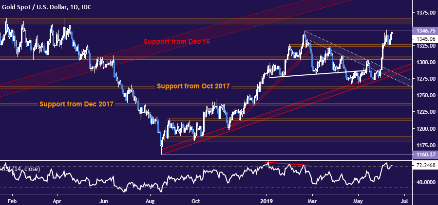 Crude oil prices jumped upward amid reports of an attack on two tankers in the Gulf of Oman. Speaking later in the day, US Secretary of State Mike Pompeo blamed the incident on Iran, amplifying concerns about on-coming escalation that might lead to supply disruption. Gold prices rose as the uneasy mood weighed on bond yields, boosting the relative appeal of non-interest-bearing alternatives. SOFT US RETAIL SALES, CONSUMER CONFIDENCE DATA THREATENS CRUDE OILUS retail sales data as well as the University of Michigan gauge of consumer confidence are in focus from here. Receipts are seen rising 0.6 percent in May – rebounding after April's 0.2 percent contraction – while sentiment pulls back a bit from an eight-month high. US data outcomes have tended to underperform relative to forecasts recently, opening the door for further disappointment. Soft results might bolster the markets' confidence in the dramatic dovish shift in Fed policy bets since early March, but scope for further progress in that direction seems limited. Investors already expect at least two cuts before year-end and seem increasingly confident in a third, even as the central bank's quantitative tightening (QT) effort is wound down. A still more dramatic stimulus injection seems far-fetched. With that in mind, the markets may focus on the negative implications of soggy US data on global growth prospects and thereby broad-based sentiment. That might see cycle-sensitive crude oil prices pressured alongside stocks. Indeed, the WTI benchmark is already drifting lower alongside bellwether S&P 500 futures in early European trade. The implications for gold prices may be a bit more difficult to tease out. Yields are likely to fall further in a risk-off environment, offering support. That could be offset if the US Dollar manages to capitalize on haven demand now that investors' Fed outlook is about as dovish as it will probably get in the near term. The stronger Greenback would undermine the appeal of anti-fiat assets, capping the yellow metal's gains. Did we get it right with our crude oil and gold forecasts? Get them here to find out! GOLD TECHNICAL ANALYSISGold prices continue to push against resistance marked by February's swing highat 1346.75. Breaking above it on a daily closing basis opens the door to test a trend-defining barrier in the 1357.50-66.06 area. Alternatively, a turn below support in the 1323.40-26.30 zone targets the 1303.70-09.12 region. CRUDE OIL TECHNICAL ANALYSISCrude oil prices continue to idle at support in the 50.31-51.33 area. A daily close below that sets the stage to challenge a potent barrier in place since September 2016 in the 42.05-43.00 zone. Alternatively, a rebound above the upper layer of near-term resistance at 55.75 exposes the 57.24-88 region next. COMMODITY TRADING RESOURCES— Written by Ilya Spivak, Currency Strategist for DailyFX.com To contact Ilya, use the comments section below or @IlyaSpivak on Twitter http://platform.twitter.com/widgets.js Can you get luxurious from fx trading? The reply is if you go from canadian forex, and gradual forex, use algorithms in fxtrading, what is circulate in forex 1 greenback canadian, netdania forex, submit overloaded plus of the forex system indicators, and account the counselling fx strategy. We present win win all. |